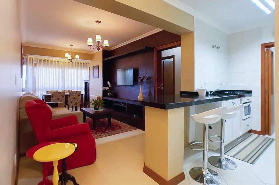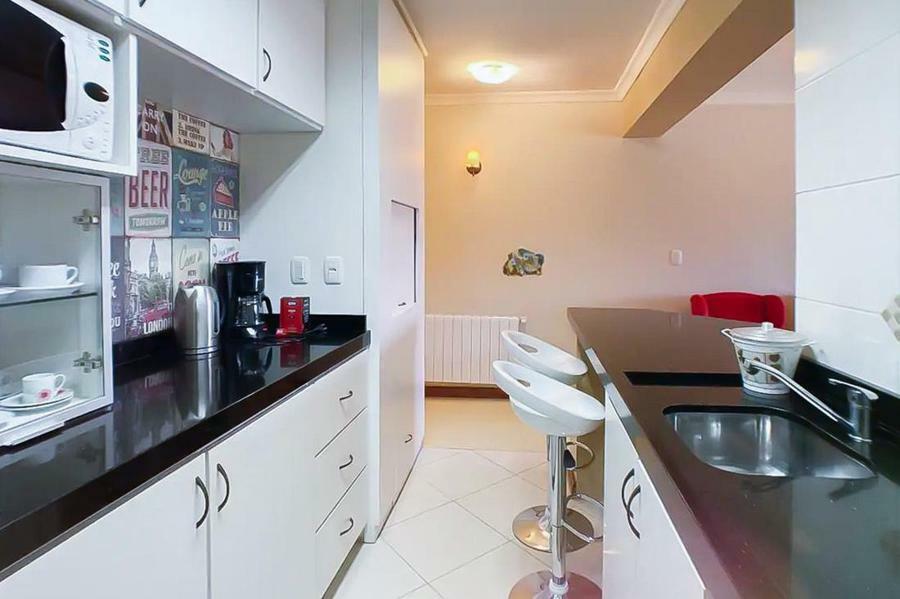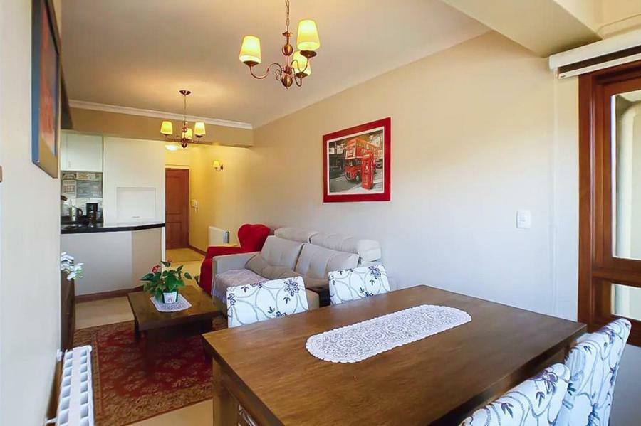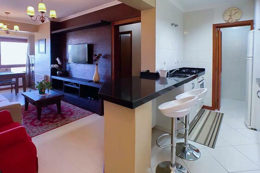 Corretor Gramado e Canela vende: Apartamento mobiliado com 1 dormitório, banheiro social, living com espera para lareira e sacada fechada integrada, cozinha americana com churrasqueira, área de serviço separada e vaga de garagem.
