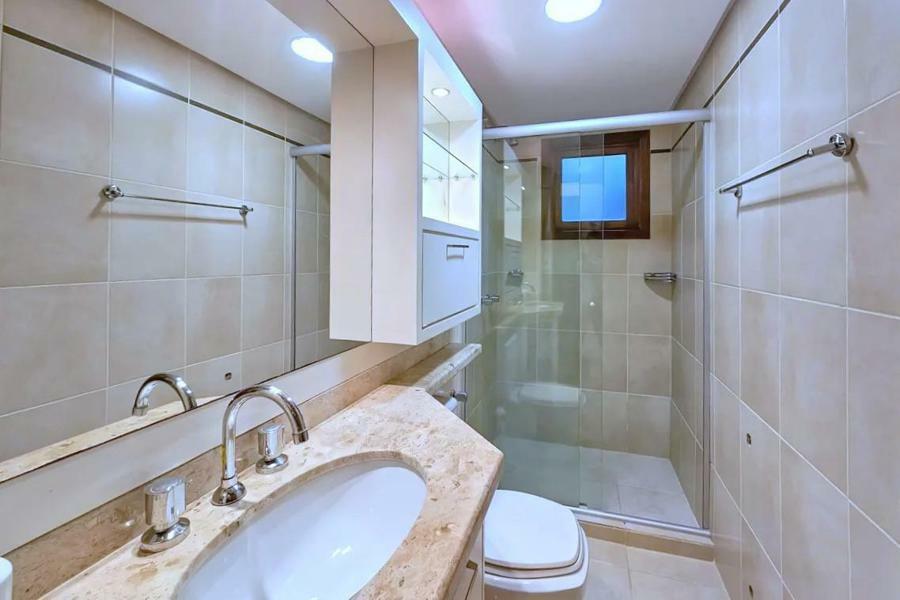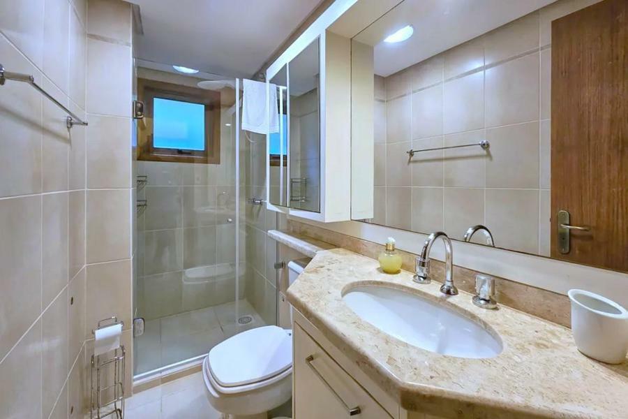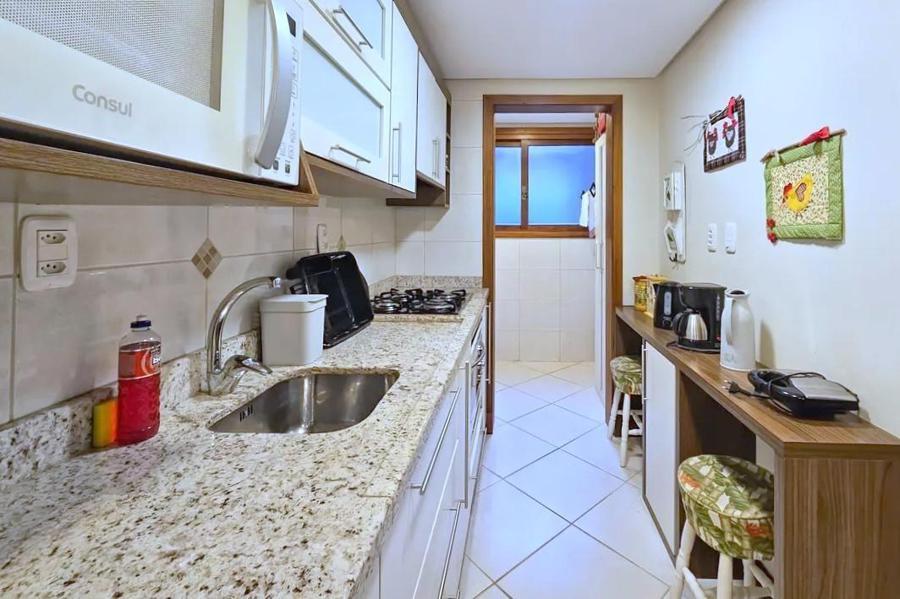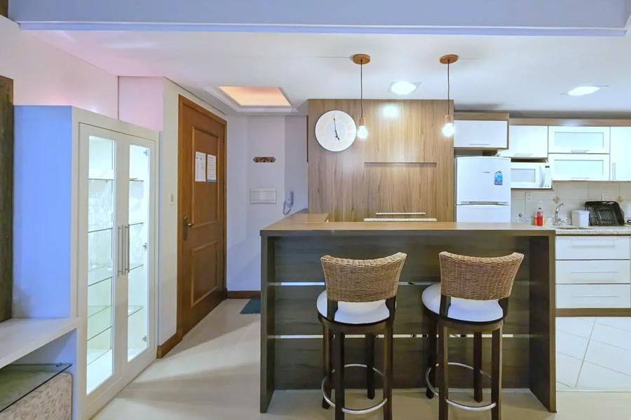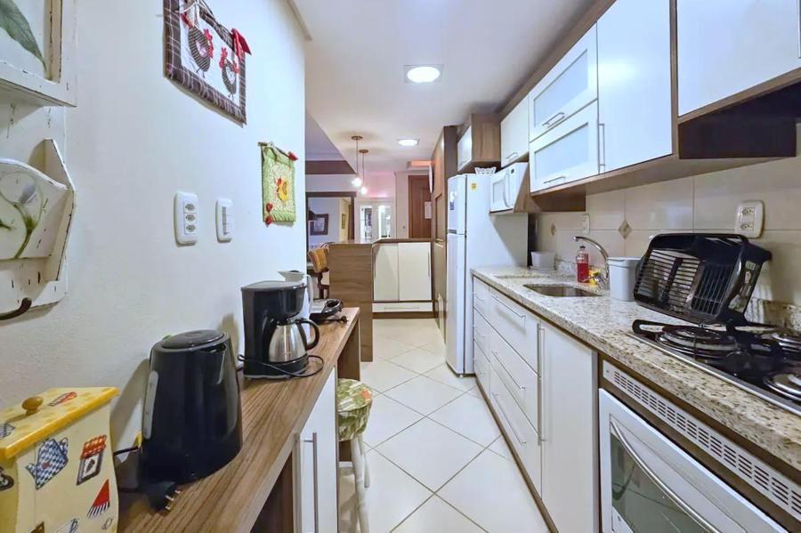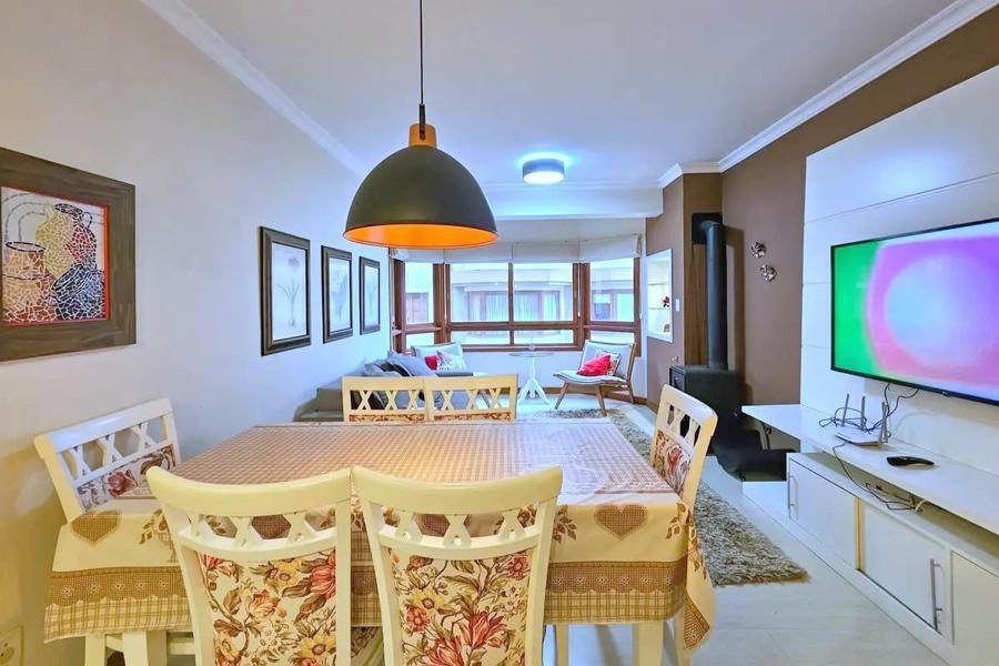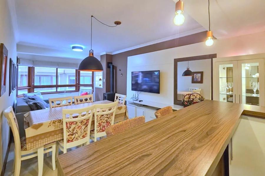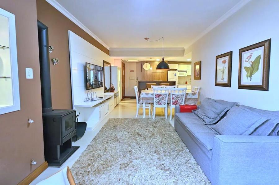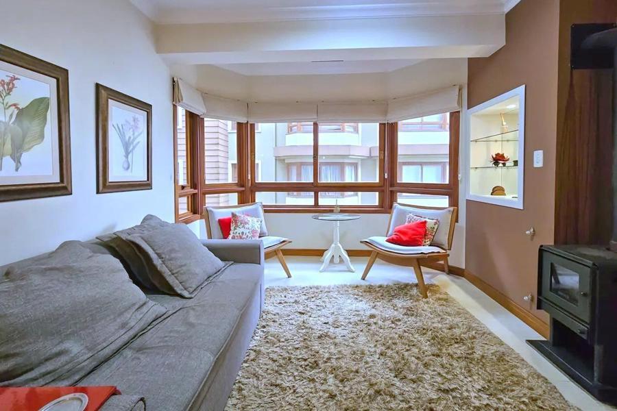 Corretor Gramado e Canela vende: Apartamento mobiliado com 2 dormitórios (1 suíte), living amplo com sacada integrada e lareira, cozinha americana com churrasqueira, banheiro social e vaga de garagem.