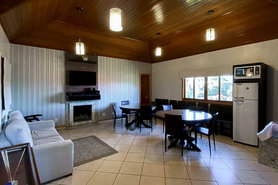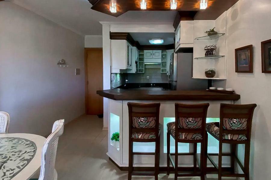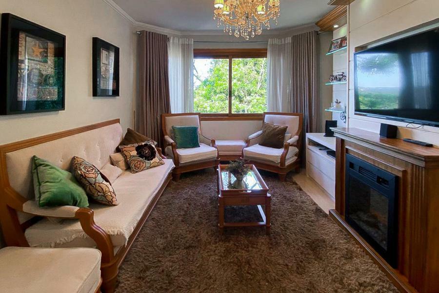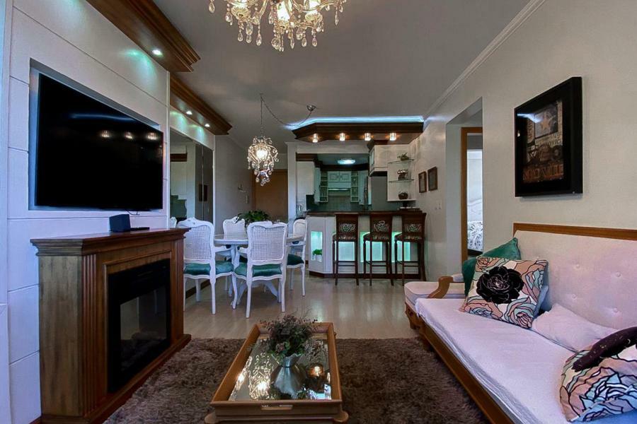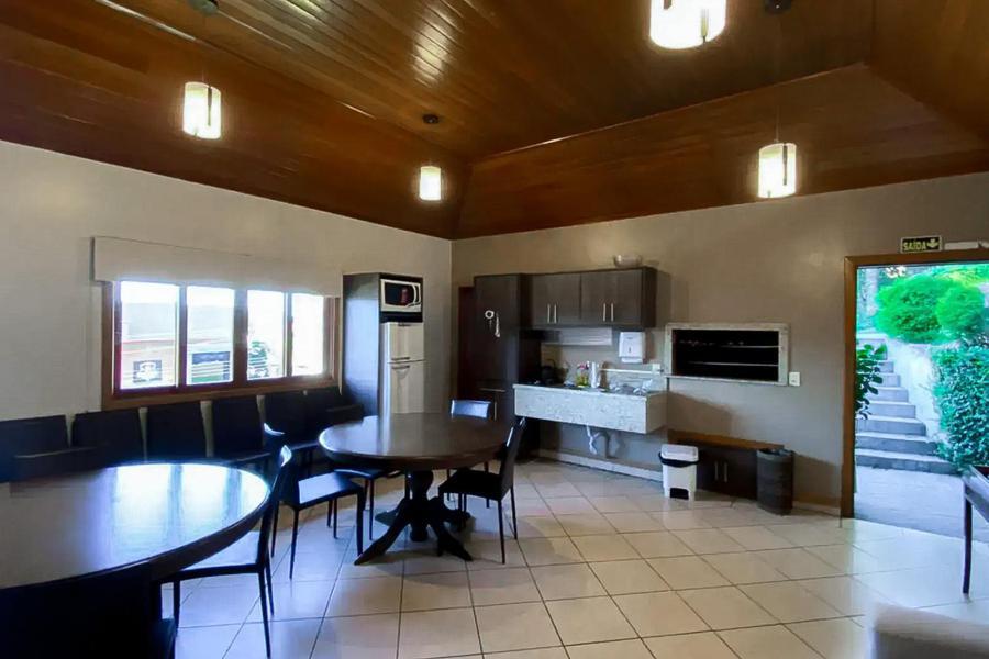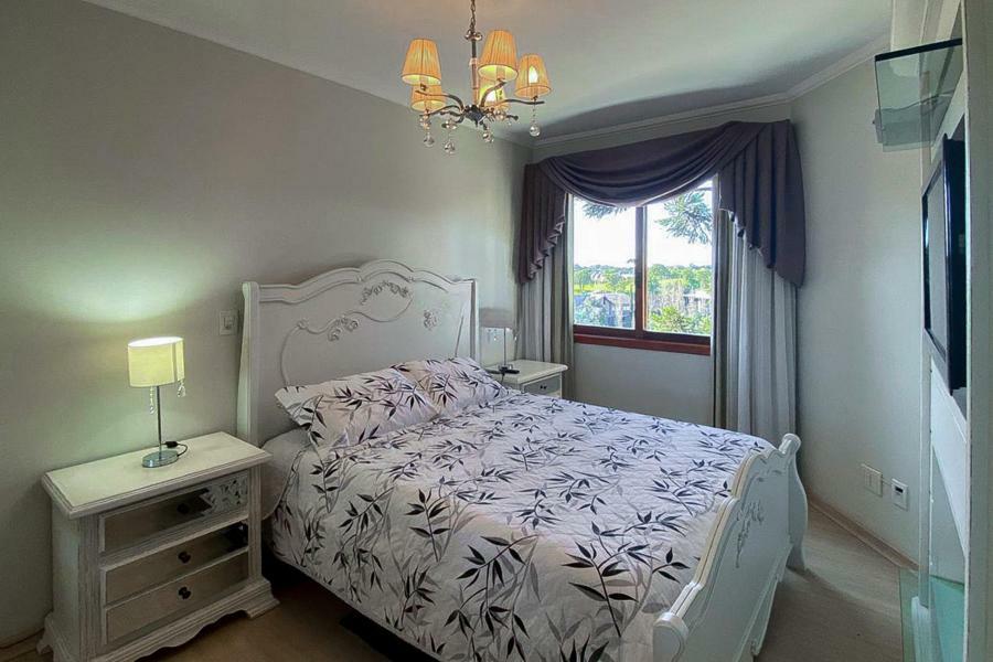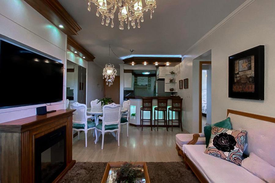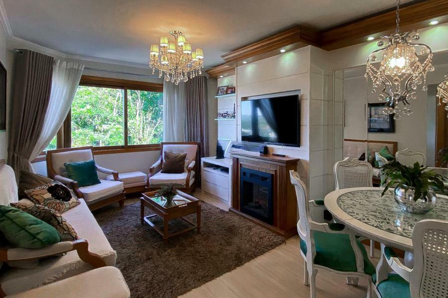 Corretor Gramado e Canela vende: Apartamento semi mobiliado composto de living integrado de estar e jantar com lareira, cozinha americana com churrasqueira, banheiro social, dois dormitórios sendo um deles suíte . Possui vaga de garagem. Prédio com elevador, salão de festas gourmet, deck com chimarródromo, lavanderia coletiva, zeladoria.