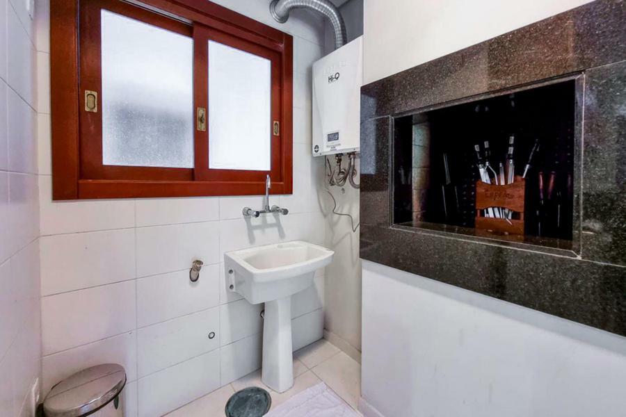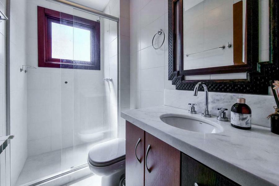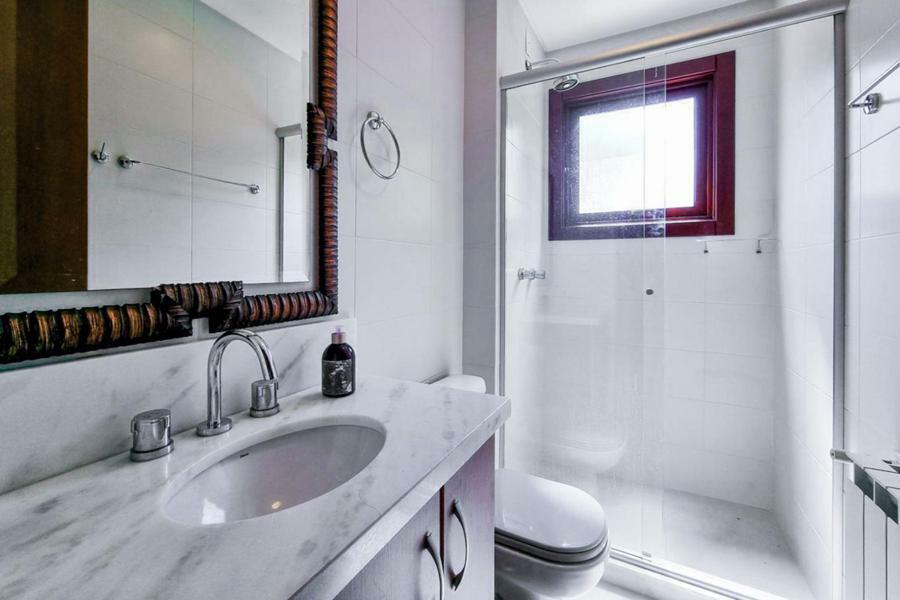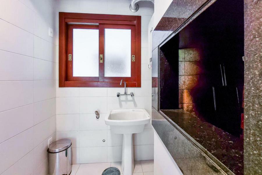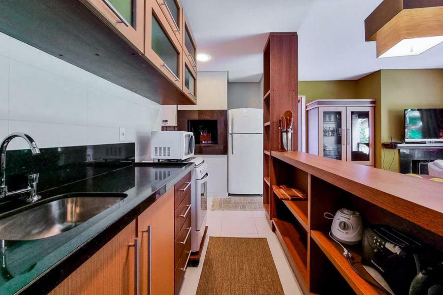 Distribuído em 2 dormitórios, sendo uma suíte. Living dois ambientes com lareira e ampla sacada com vista para o jardim, cozinha com churrasqueira e área de serviço integrada. Banho social e vaga coberta de garagem.