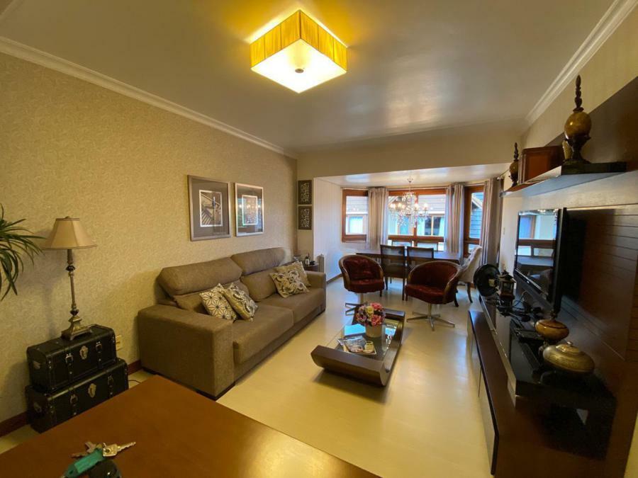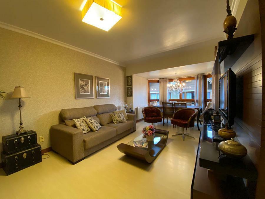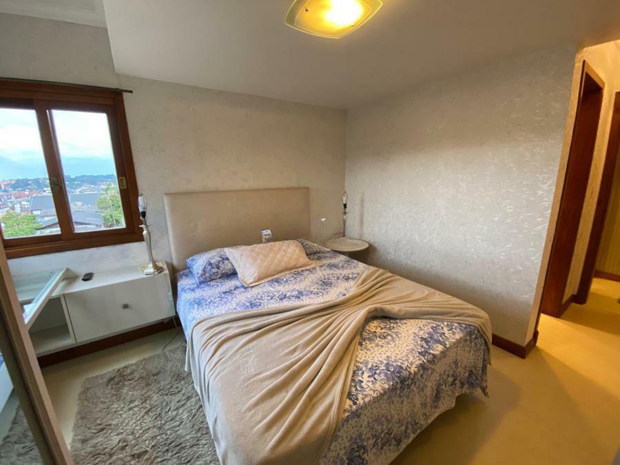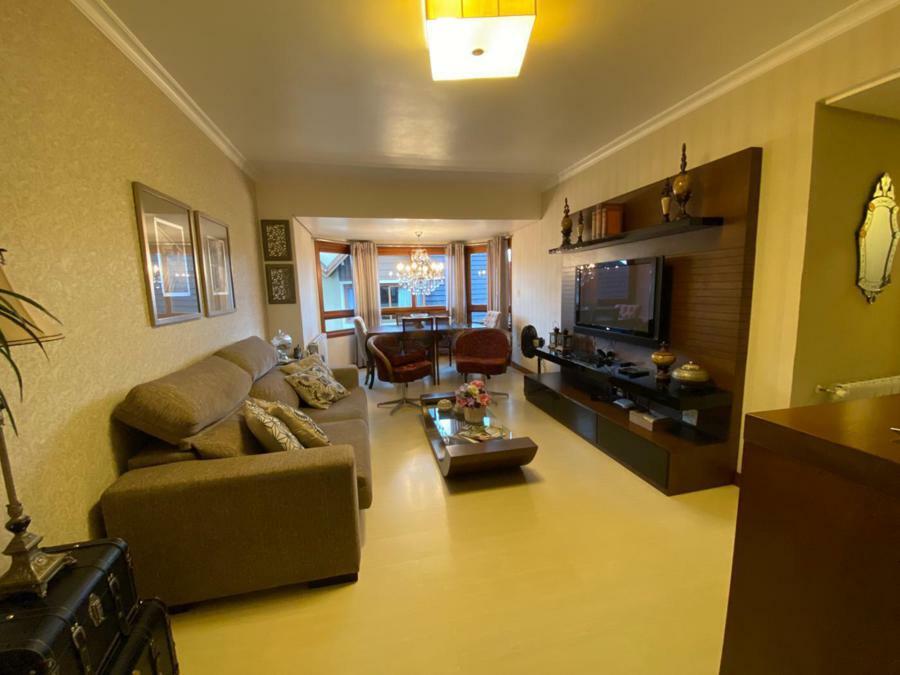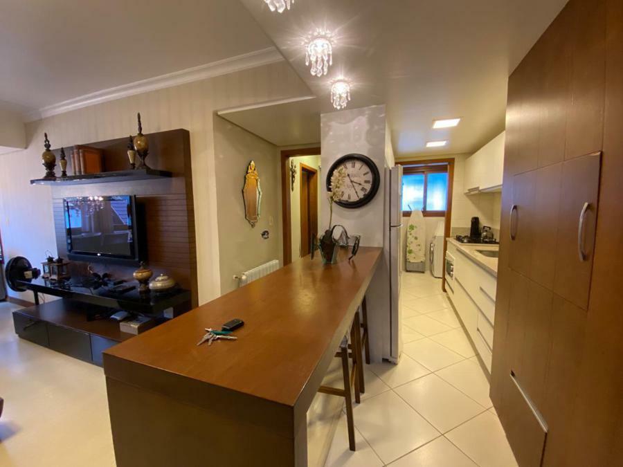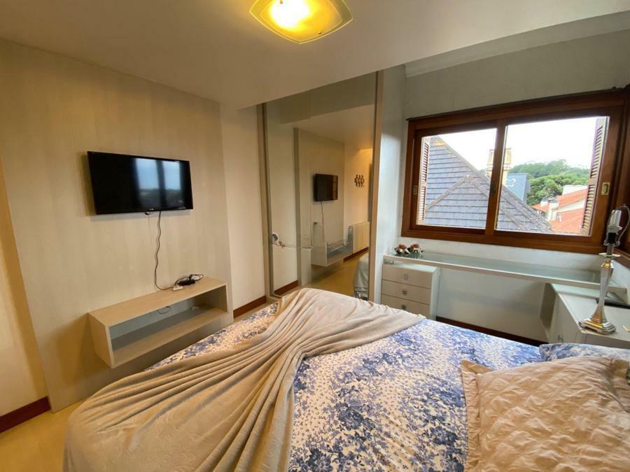 Corretor Gramado e Canela vende: Mobiliado perto do centro. Apartamento 2 dormitórios ( 1 suíte ), living amplo com sacada integrada e lareira, cozinha americana com churrasqueira, banheiro social e vaga de garagem.