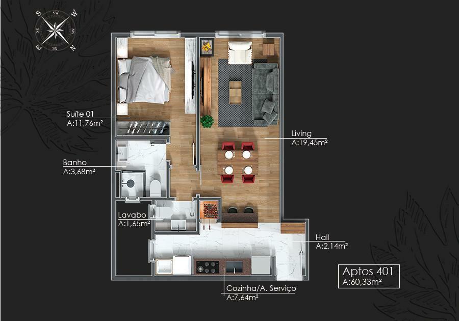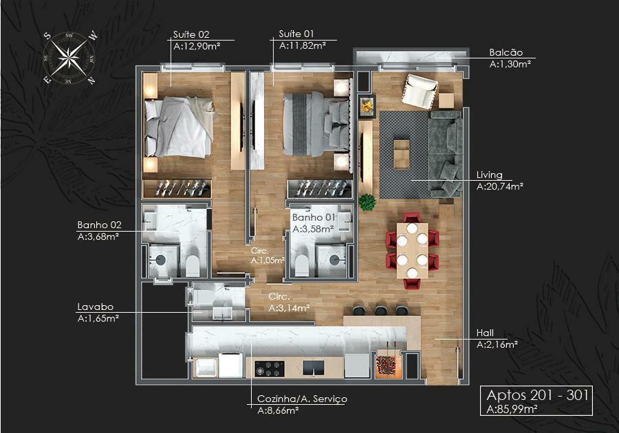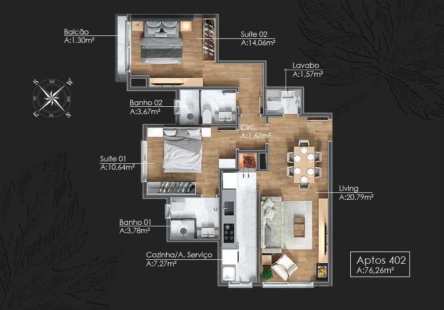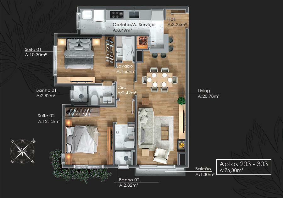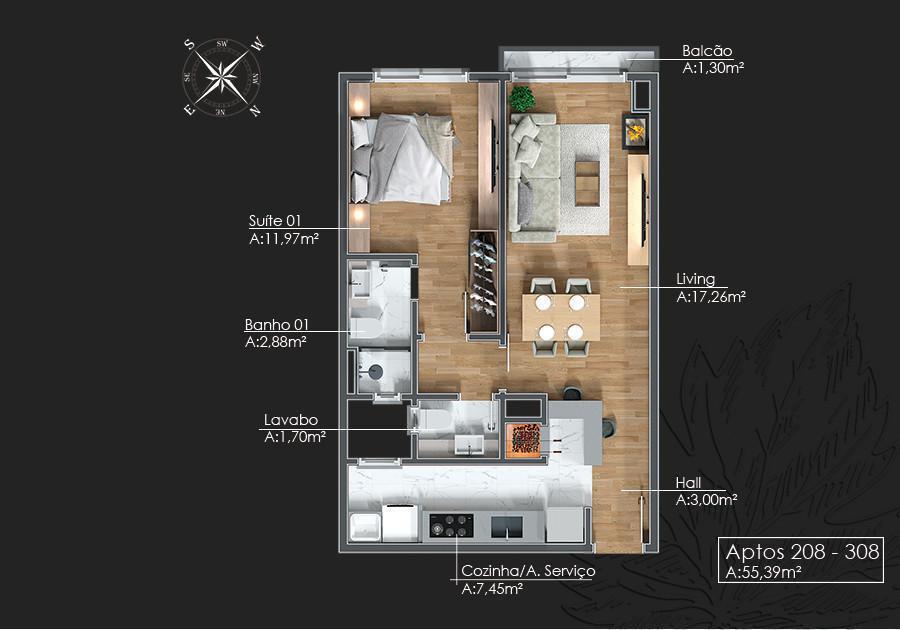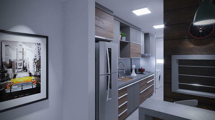 Composto por uma e duas suítes, churrasqueira, esperas para lareira e Split, esquadrias em PVC com vidro duplo, pisos laminado e porcelanato, massa corrida nas paredes e forro em gesso, prédio com elevador e 1 box de garagem para cada unidade.