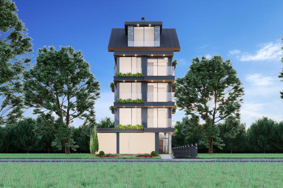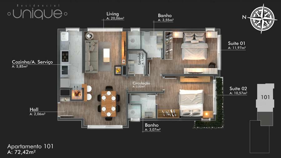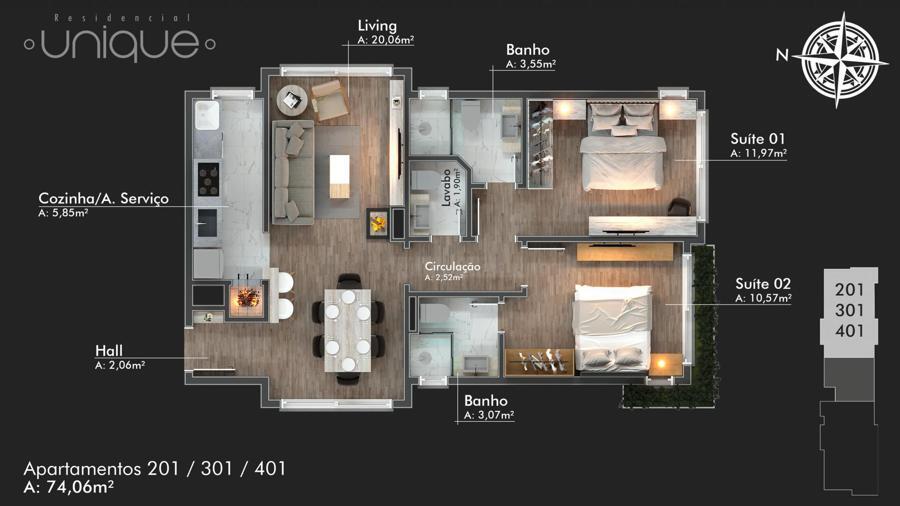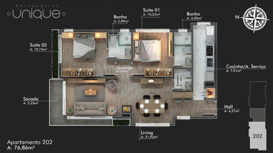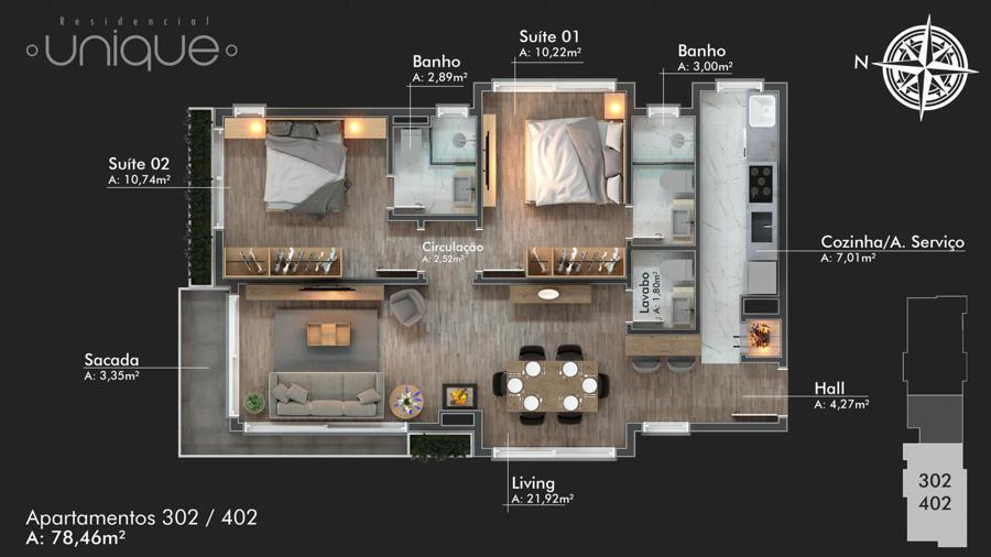 Será constituído por 07 unidades compostas de 02 suites + 01 cobertura composta de 01 suite. Todos os apartamentos contaram com 01 lavabo, cozinha integrada com área de serviço e churrasqueira, living com lareira, esquadrias pretas em PVC cm vidros duplos, rebaixo em gesso, massa corrida nas paredes, piso aquecido nos banheiros, piso vinílico e porcelanato.