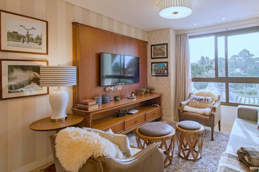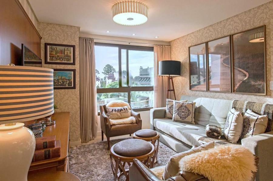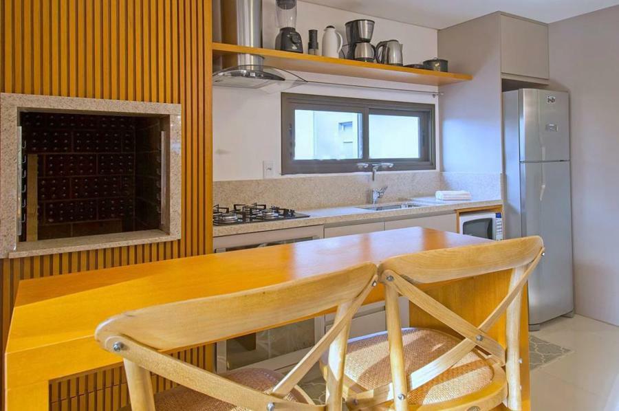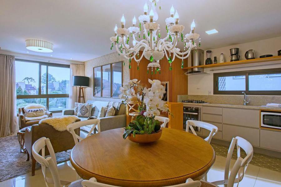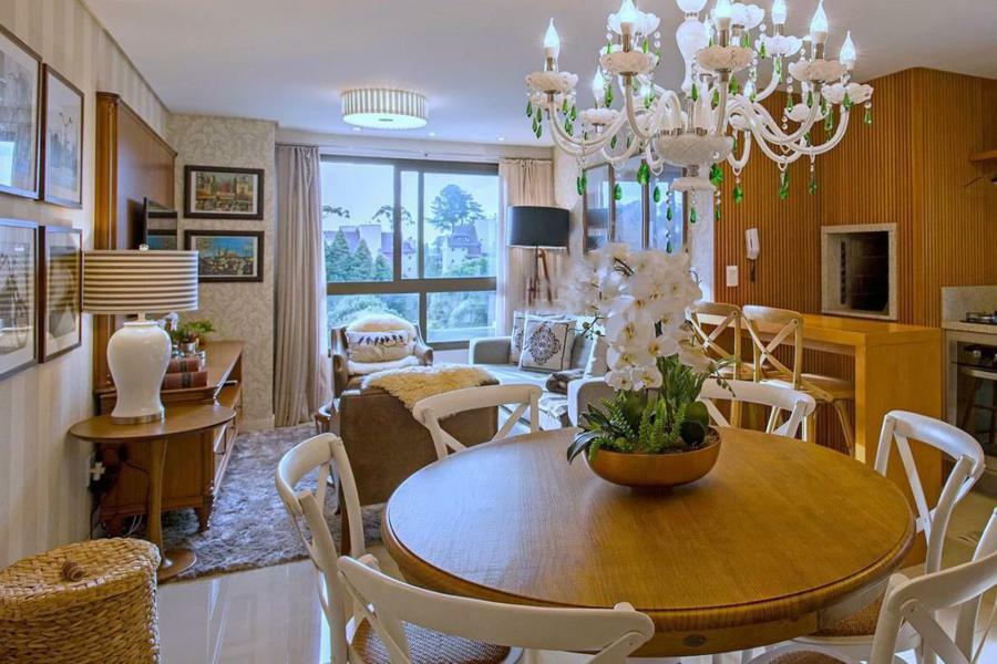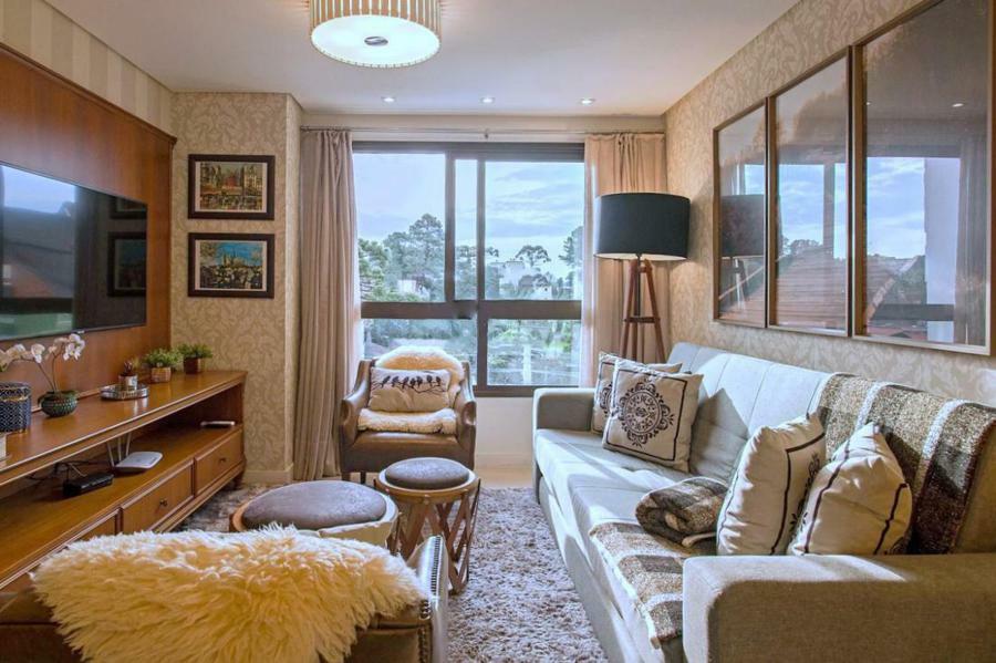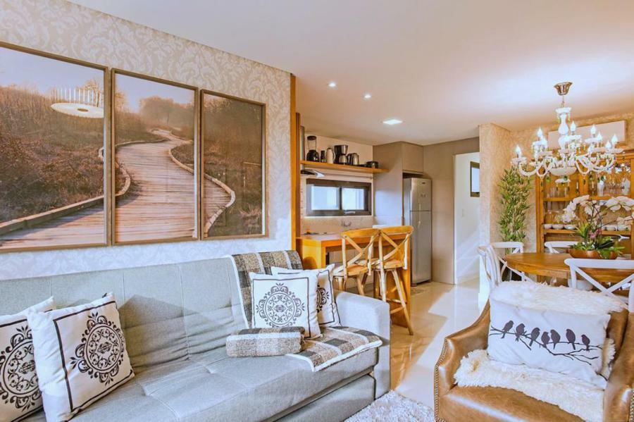 Corretor Gramado e Canela vende: Mobiliado, praticamente novo. Apartamento com 2 dormitórios (1 suíte), living com sacada integrada e espera para lareira, cozinha americana com churrasqueira e vaga de garagem.