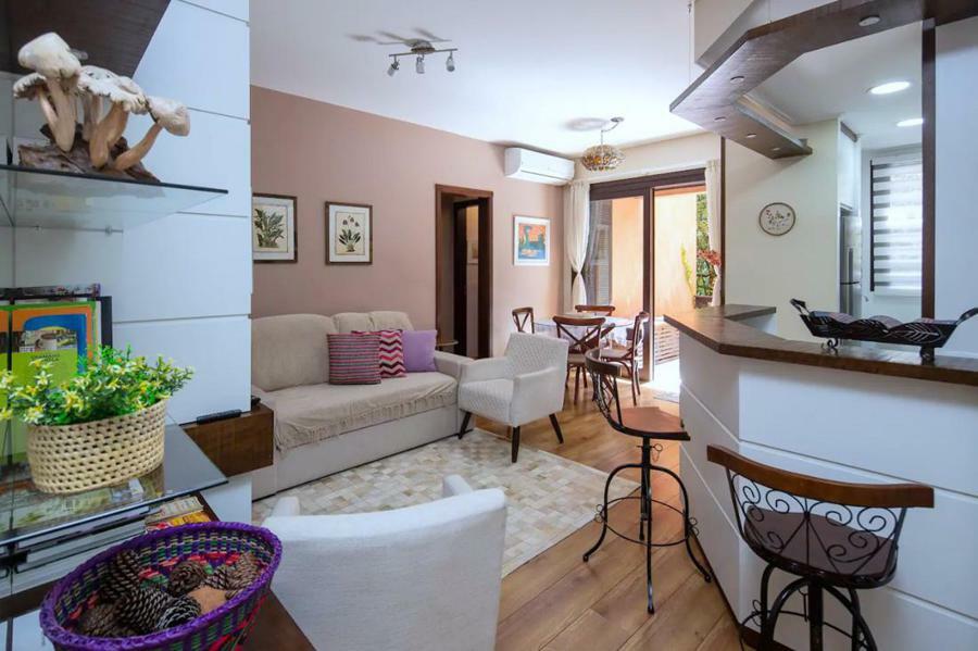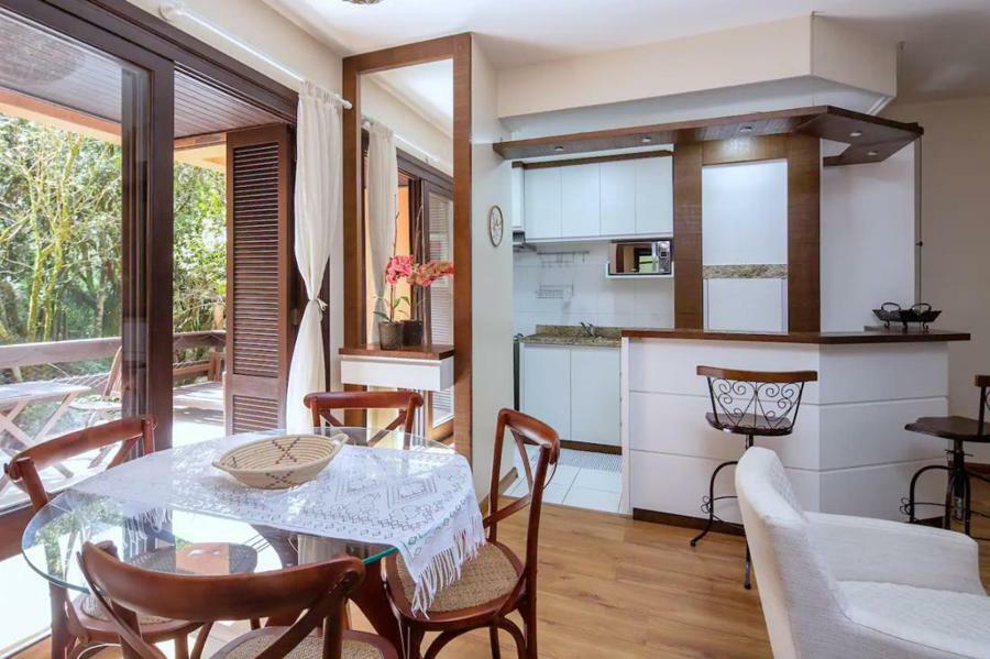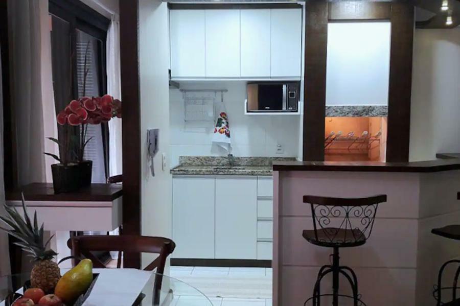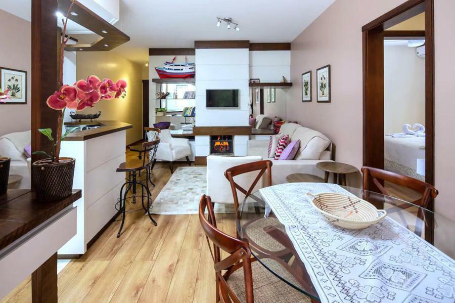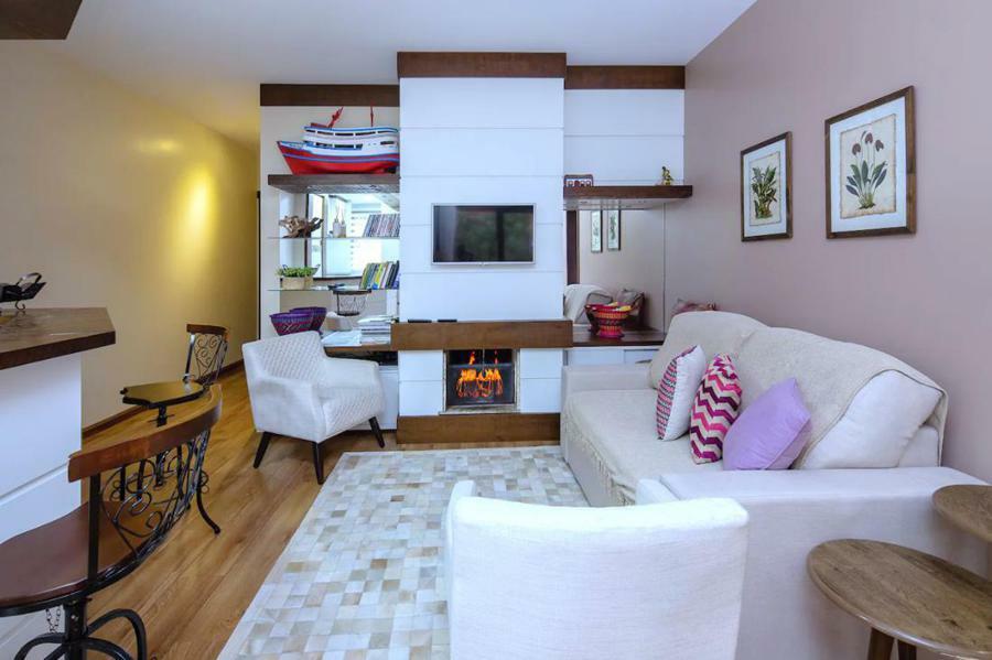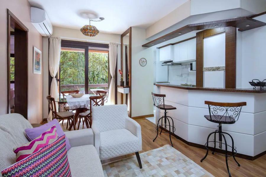 Corretor Gramado e Canela vende: Apartamento com duas amplas sacadas, iluminado e ensolarado, dois dormitórios, sendo um suíte com banheira, finamente decorado e equipado com louças, eletrodomésticos, calefação e ventiladores de teto com controle remoto, Água quente instalada, Sala de estar com lareira, Cozinha americana com churrasqueira, Área de serviço Banheiro social, vaga de garagem.