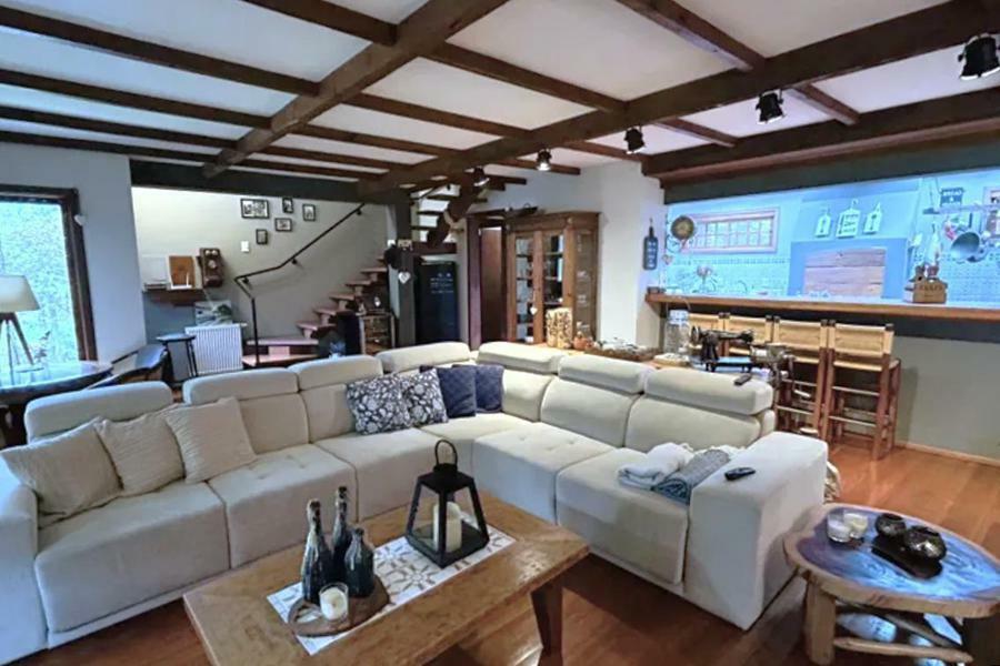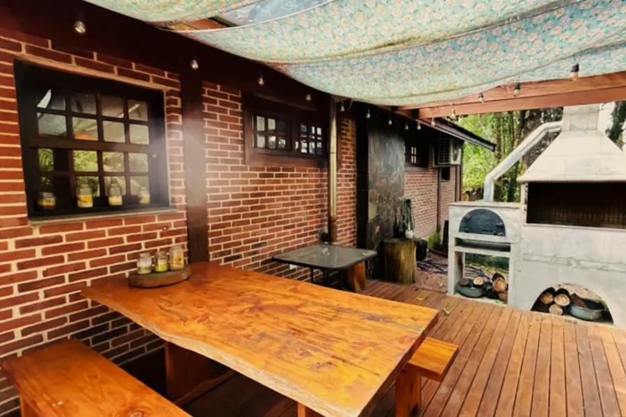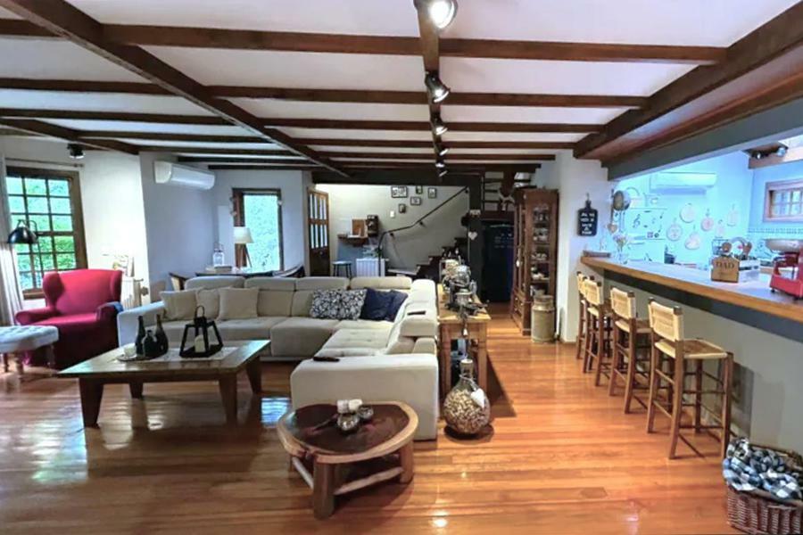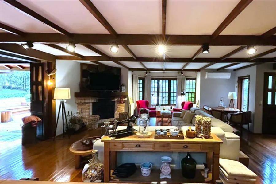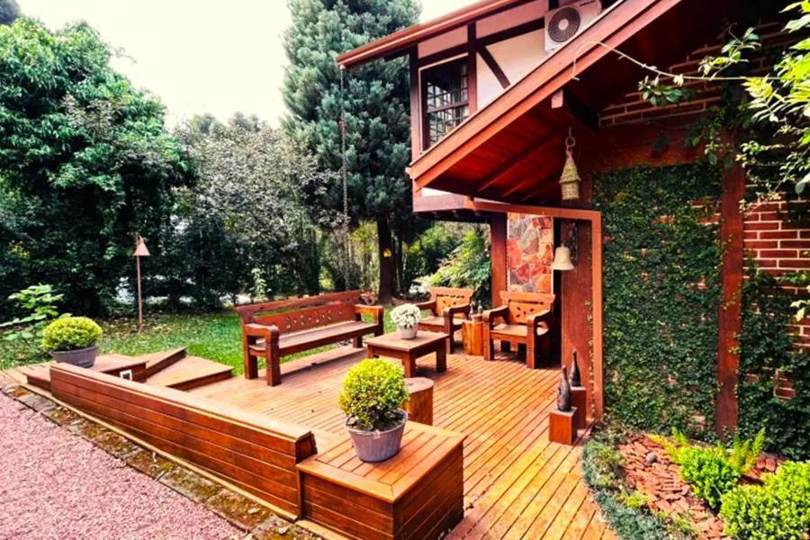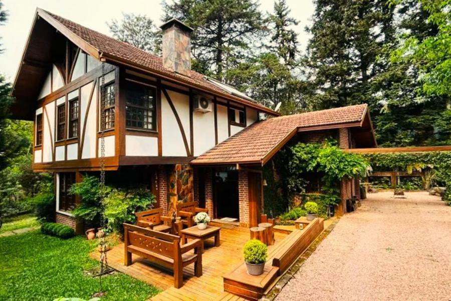 Corretor Gramado e Canela vende: Casa localizada no bairro Planalto, em Gramado. Com 3 amplos dormitórios, sendo 1 suíte térrea com closet, banheiro social, lavabo, split, sala de estar espaçosa com lareira, sala de jantar, cozinha planejada, churrasqueira, área gourmet integrada ao jardim, fogo de chão, área de serviço, uma vaga para carro com pergolado.