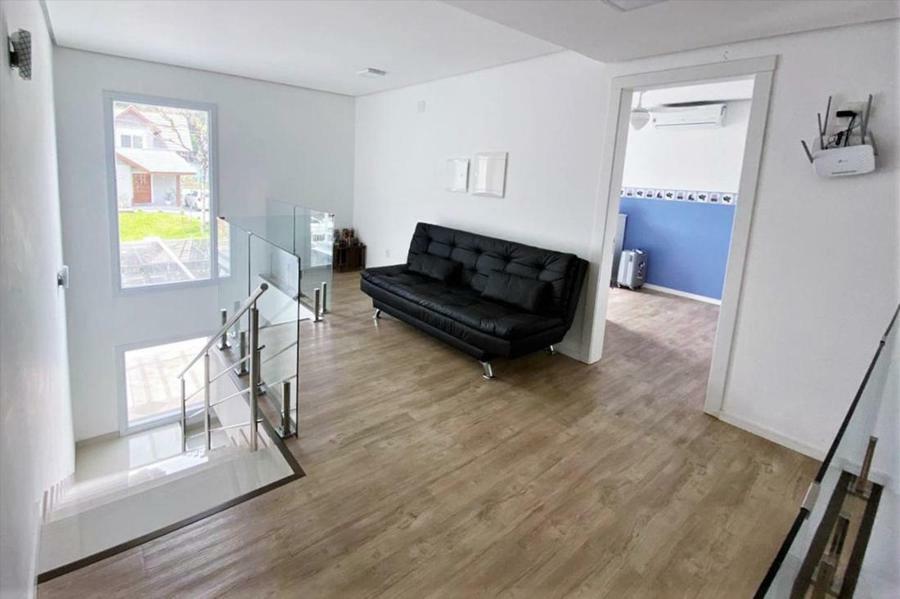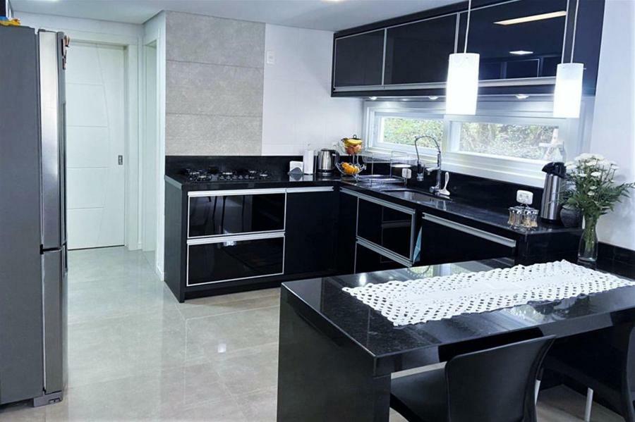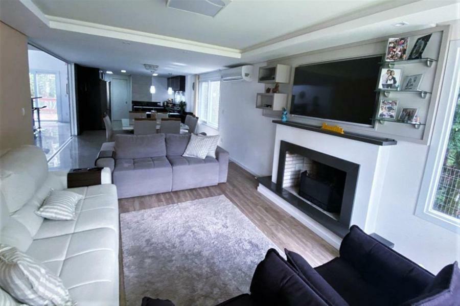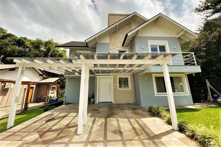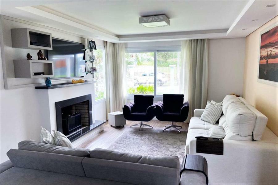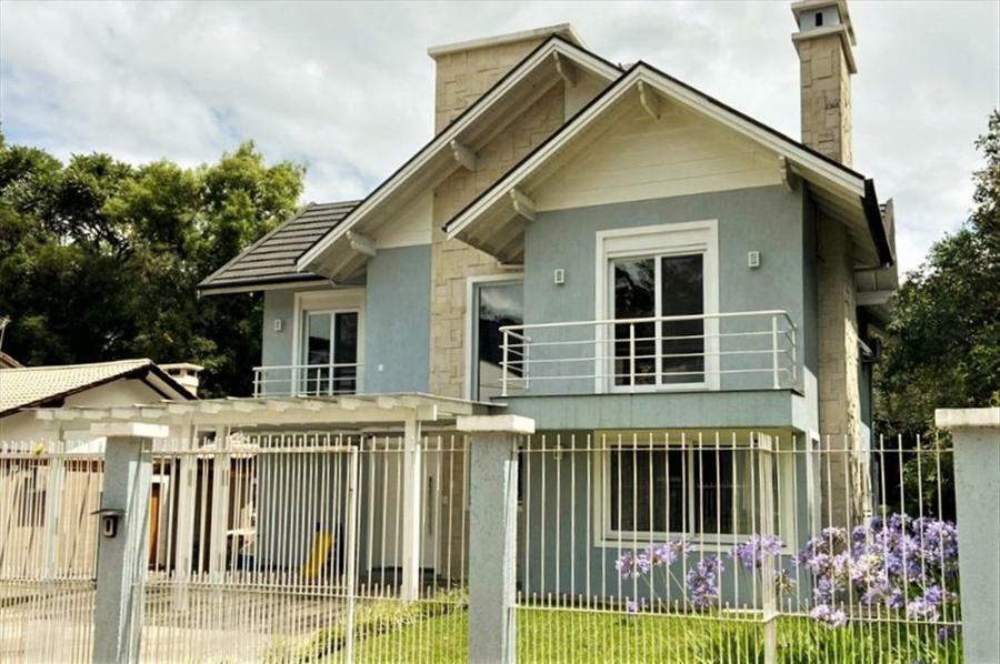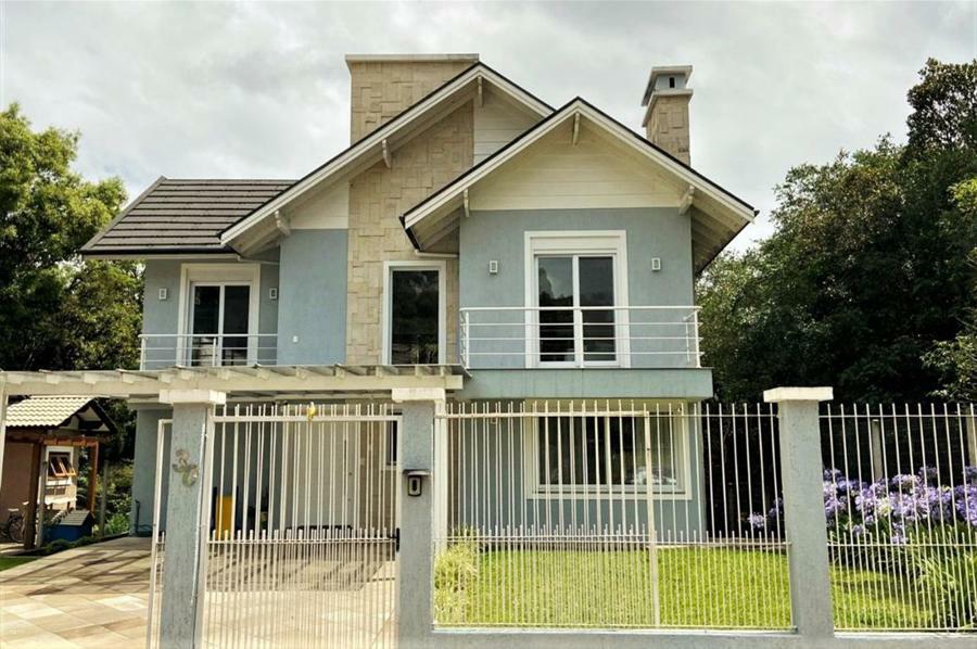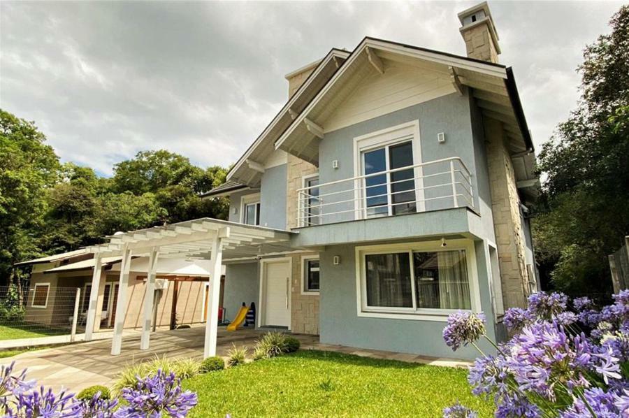 Corretor Gramado e Canela vende: Mobiliada, com terraço. Casa com 4 dormitórios (3 suítes), living com lareira, estar íntimo/mezanino, espaço gourmet com churrasqueira e varanda, cozinha americana, área de serviço, pátio e garagens.