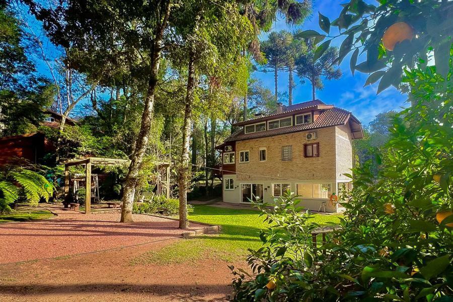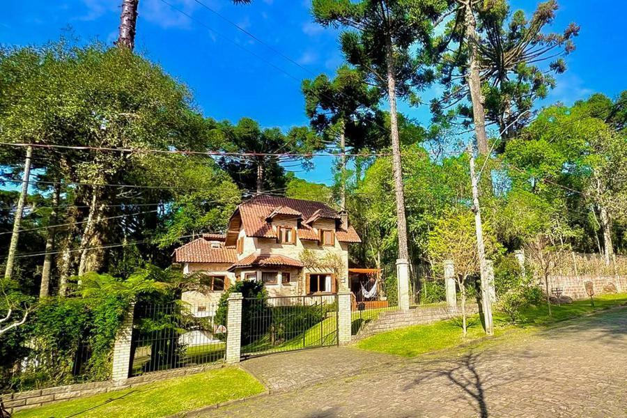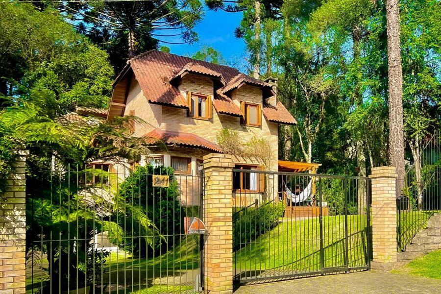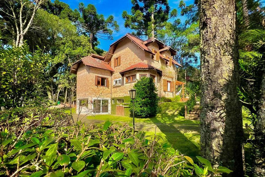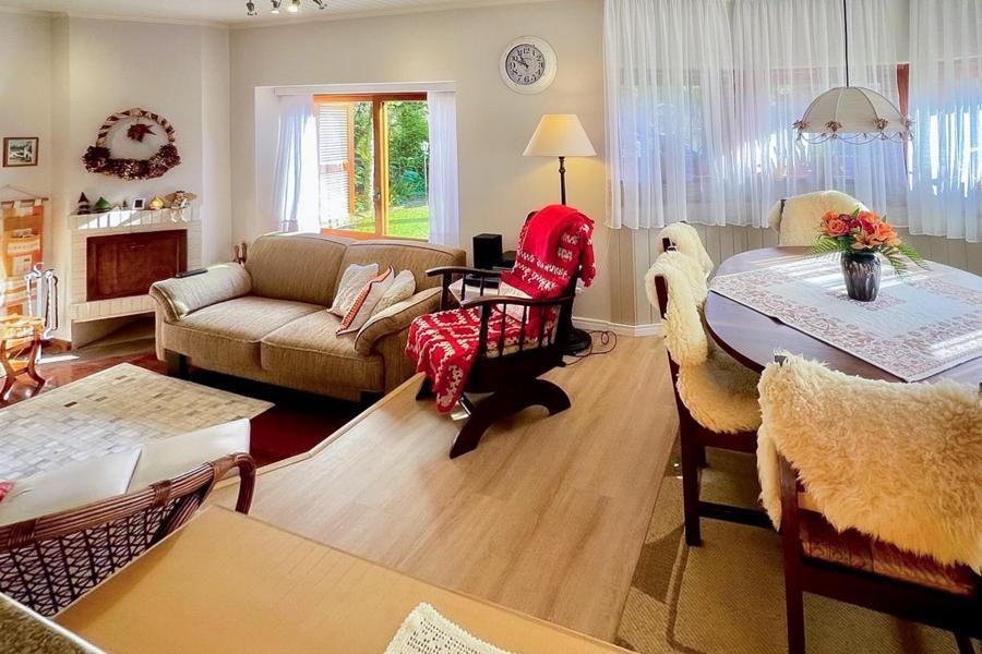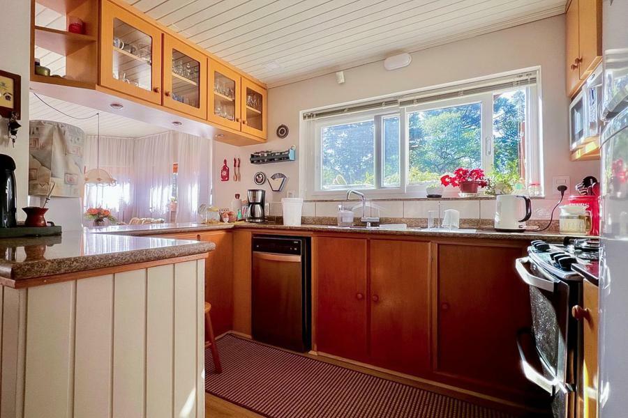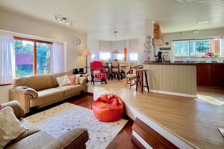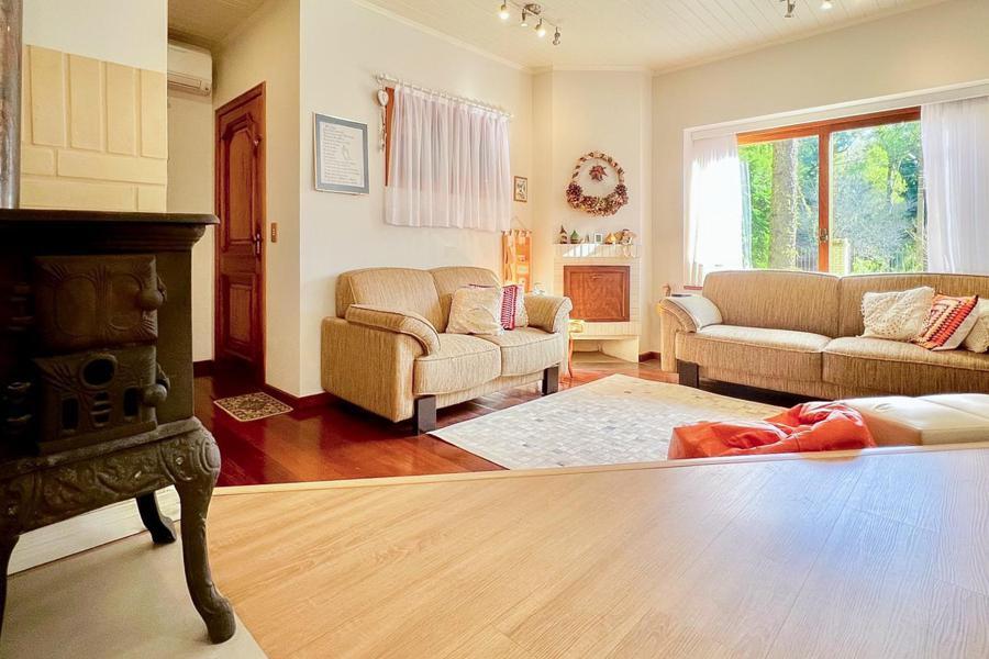 Corretor Gramado e Canela vende em Canela RS: Casa com 5 dormitórios (1 suíte térrea), living com lareira espaço de estar e jantar integrados a cozinha americana, espaço gourmet com churrasqueira e forno de pizza, lavabo, área de serviço, banheiro social, sala de estar íntimo, garagem fechada com banheiro e um espaço para oficina ou depósito, amplo e lindo jardim.